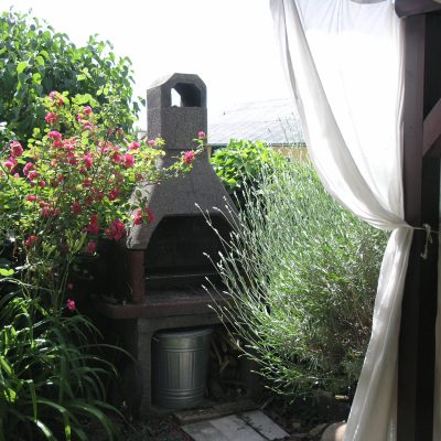 Durch den Garten hindurch gelangen sie zur Rückseite des Hauses. Von dort führt eine Treppe direkt zum Eingang des Apartment.